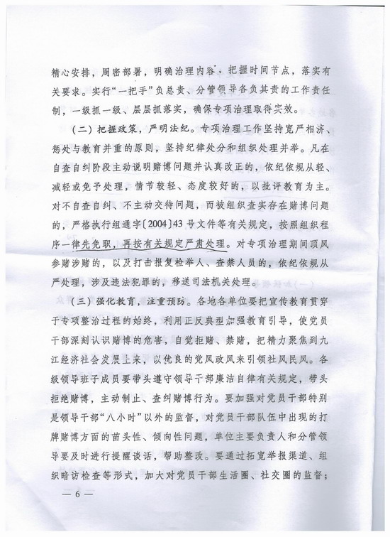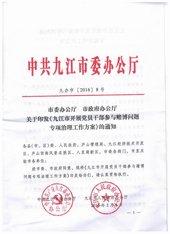 九江市市委办公厅、市政府办公厅关于印发《九江市开展党员干部参与赌博问题专项治理工作方案》的通知