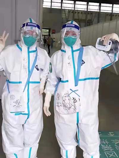 作为团队中年龄最小的一位队员,姜慧总是做事积极主动。在很多休息间隙时间,她总是闲不住,想着做些额外的工作来帮助大家。她发现大家的防护服没有口袋不方便,她就找到心灵手巧的刘柳,自己动手做了一批小背包,用于放置对讲机、pda等用品,上面还手绘了卡通图案,给医护人员和舱友们加油打气。在方舱医院支援的这些天里,她们每次上班都是“分内事”“分外事”一起干,像只勤劳的小蜜蜂在忙碌中度过。虽然辛苦,但是活力、开朗才是她们在这座方舱里的标签。和其他援沪“大白”一样,心中都有同样的信念,一定要早日打赢这场仗。