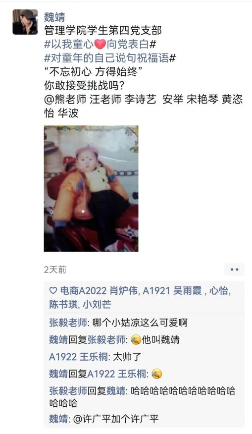 童年初心,时光如梭。分享童年的纯真、快乐,观照当下不忘初心、砥砺前行。整个活动在朋友圈进行,由管理学院学生第四党支部支委发起,分享童年照片和祝福语,并@支部内外师生。被@到的党员群众积极参与,热情点赞、评论、转发,再@传播给更多人。不少人在童年照片下留言,一时间朋友圈气氛热烈、正能量“满屏”。