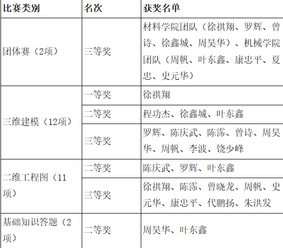 近年来,学校不断推进教育教学改革,积极组织学生参加各类学科竞赛,以赛促教、以赛促学、以赛促改。本次大赛成绩的取得,充分展现了我校学生在先进成图技术与产品信息建模方面的实践动手能力、综合设计能力以及团队协作精神。大赛为学生明确了专业学习方向,为促进知识、能力、创新意识全面协调发展提供了锻炼机会,也为我校教师与兄弟院校教师在教学研究和学科竞赛等方面的交流提供了平台。