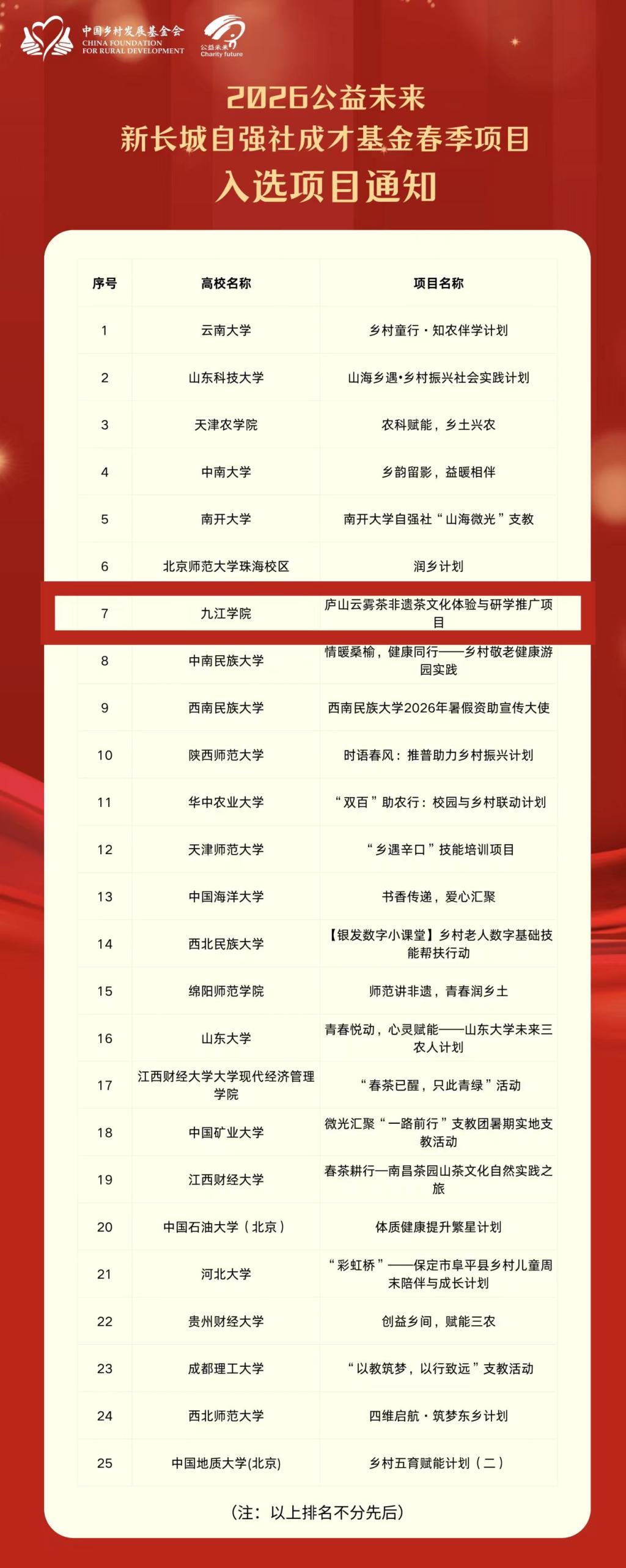 近日,2026公益未来·新长城自强社成才基金春季项目评审结果正式揭晓。由校学生工作处(学生资助管理中心)指导的新长城九江学院自强社申报的《庐山云雾茶非遗茶文化体验与研学推广项目》成功入选。本次春季项目原定支持16个名额,评审组结合申报项目整体质量增补9个名额,最终全国仅25个高校项目脱颖而出获得支持,我校项目成功跻身其中,充分彰显了九江学院青年学子立足专业、赋能乡村、传承文化、勇担使命的青春风采。